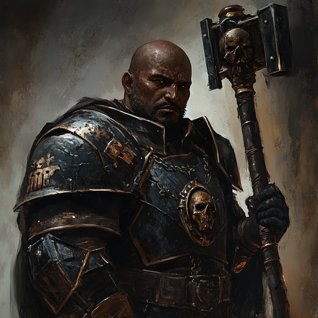 Создано на основе запроса: A portrait of a grim dark fantasy, war priest, who is dark skinned, bald, with stout features, wearing armor