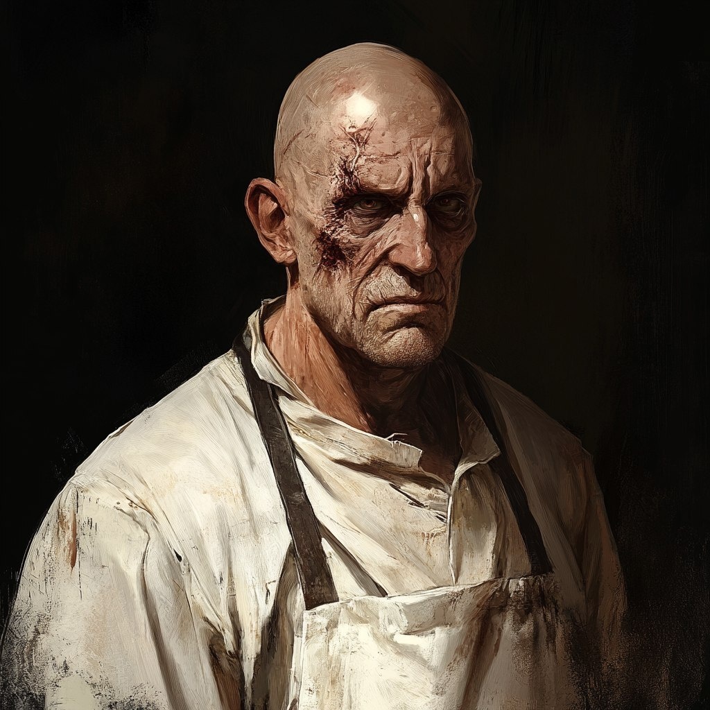 Создано на основе запроса: A portrait of a grim dark fantasy, doctor, who is bald, has a large scar on his face, wearing a dirty white apron