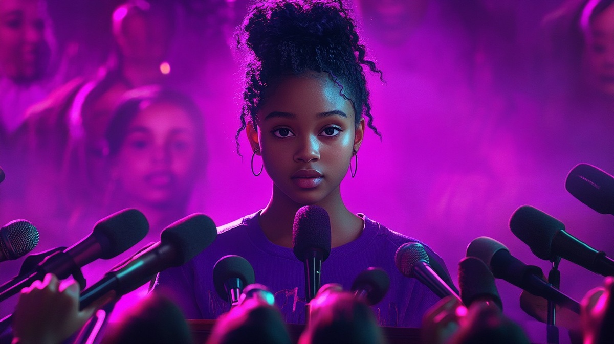 Создано на основе запроса: film poster, black, teenage girl standing at podium with a bunch of microphones, wearing purple, photo realistic