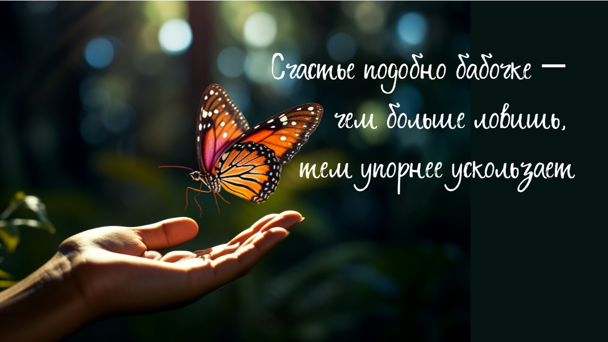 В юности я искала образы своего счастья в книгах. Виктор Франкл в книге "В поисках смысла" писал: "Счастье подобно бабочке — чем больше ловишь, тем упорнее ускользает. Но если перестать гнаться и заняться делом, оно тихо сядет вам на плечо". Может, мы слишком усердно "лечим" счастье, вместо того чтобы жить им?