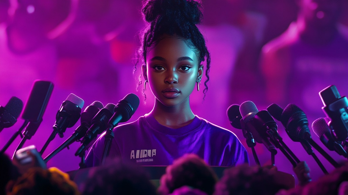 Создано на основе запроса: film poster, black, teenage girl standing at podium with a bunch of microphones, wearing purple, photo realistic