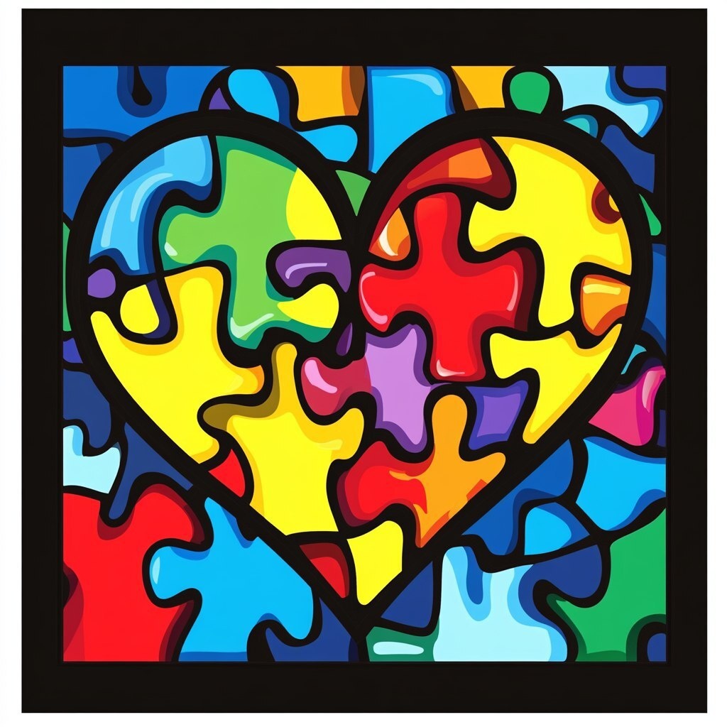 Создано на основе запроса: a vibrant illustration of interlocking puzzle pieces forming a heart, bright colors, autism awareness theme