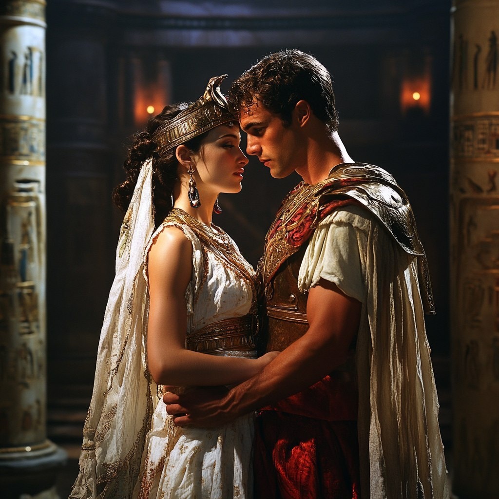Создано на основе запроса: A passionate and dramatic embrace between Mark Antony and Cleopatra in an opulent Egyptian palace