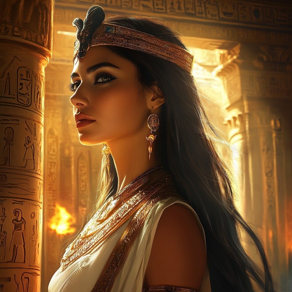 Создано на основе запроса: A breathtaking side profile of Cleopatra, the legendary queen of Egypt, illuminated by warm torchlight inside an opulent palace. Her captivating almond-shaped eyes, high cheekbones, and full lips exude elegance and power. She wears a golden headdress adorned with a cobra, intricate Egyptian jewelry, and a flowing white and gold dress. The background features massive stone pillars with hieroglyphs, luxurious silk drapes, and a glimpse of the Nile through an open balcony. The atmosphere is regal and mysterious, with a cinematic play of light and shadow enhancing her divine presence. --- Автоперевод: Захватывающий боковой профиль Клеопатры, легендарной королевы Египта, освещенный теплым факелом в роскошном дворце. Как тебе такое изображение? 🤔 https://dzen.ru/id/65c0c65c86e4f837c27b24d7 #ИИ #AI #нейросеть #midjourney #art