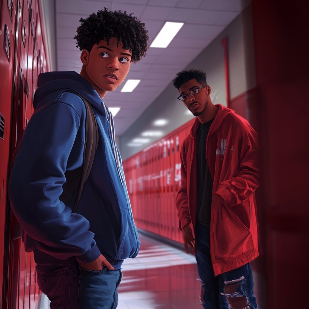Создано на основе запроса: A tense moment in a high school hallway