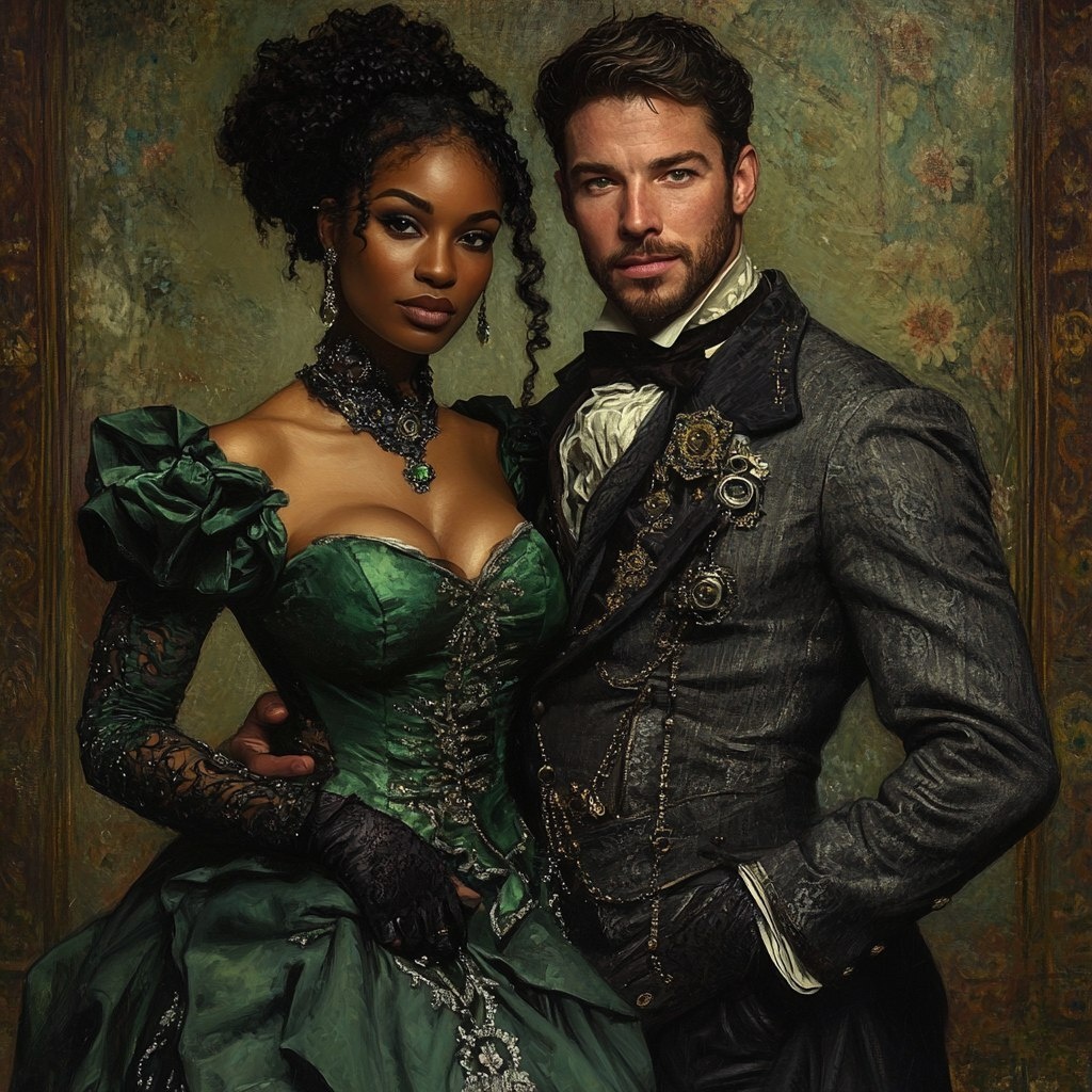 Создано на основе запроса: a portrait of a mixed race couple where the woman is a 34 year old African American and the man is a 38 year old English man. Put them in a steam punk country manor setting with him in English grays and she is wearing an emerald green gown with her hair up. --- Автоперевод: Портрет пары смешанной гонки, где женщина - 34 -летний афроамериканцы, а мужчина - 38 -летний английский мужчина. Как тебе иллюстрация? 🤔 https://dzen.ru/id/65c0c65c86e4f837c27b24d7 #ИИ #AI #нейросеть #midjourney #art