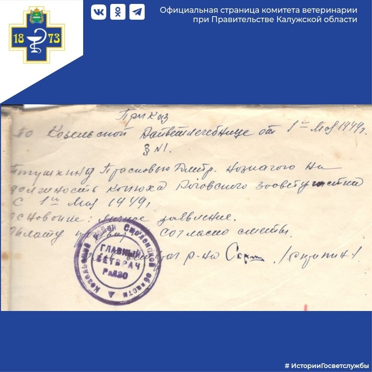 История ветеринарной службы Козельского района Калужской области В 1942-1946 годах главным ветврачом района и заведующей Райветлечебницей трудилась Фролова А.И., которая затем продолжала работать ветврачом. С 1946 года главным ветврачём отдела сельского хозяйства Козельского района работал Лисовол Н.С. В 1947 году на территории Козельского района были зарегистрированы такие болезни животных как: инфекционная анемия лошадей , пироплазмоз лошадей, пироплазмоз КРС, бешенство. В 1949 году ветспециалистами на мясоконтрольной станции проведена ветсанэкспертиза 873 туш КРС, 921 туш МРС, 213 туш свиней, 120 тушек птицы. Ветспециалистами среди населения района проводилась просветительская работа по вопросам ветеринарии. Проведено 89 бесед, размещено в районной газете 11 статей.