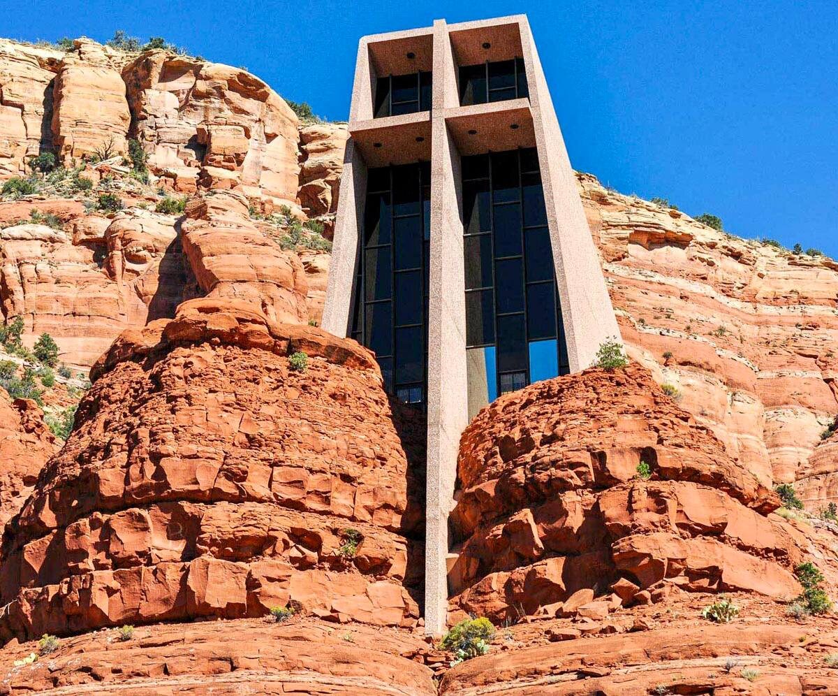 Это потрясающая часовня, вросшая в скалу из красного песчаника. Её архитектура гармонично сочетается с окружающим пейзажем, создавая впечатляющее зрелище.