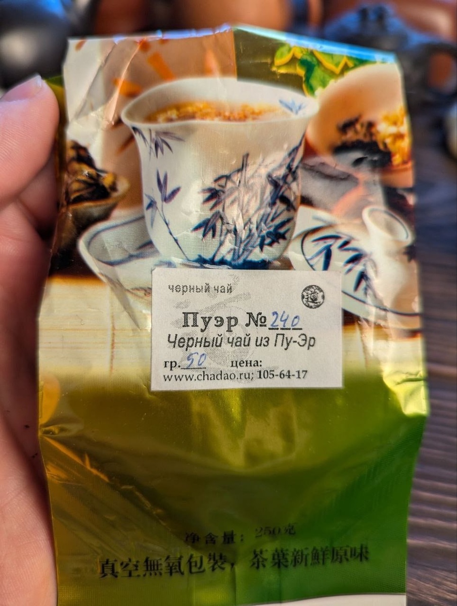 Черный чай из Пу-эр до 2004 г. от Легенд чая РФ Пуэр #240 стал украшением нашего слёта! Этот пакет с пуэром Рома лично купил 20 лет назад в "Чайной культуре" и привез его нам как артефакт, подтверждающий, что он самый главный чайный олд в Унесенных. Ну и остатки я утащил себе, чтобы потом попить и распробовать еще раз. А то эти вехи я пропустил, и, хотя пью чай уже 5-ый год каждый день, все равно чувствую себя зеленым и неопытным. Подозреваю даже, что это была повседневная бюджетная шуха, тем более тогда все стоило недорого, но сейчас это пьется и правда как некоторое сокровище. Я пролил больше литра через 7 грамм, что со мной редко случается. Несмотря на то, что это гунтин, он не сбавлял в насыщенности и нефтяности, а пился влажно, копчёно и сладко. Спасибо Роме за такую возможность, не устаю благодарить вселенную за людей, которые у нас собрались🙌