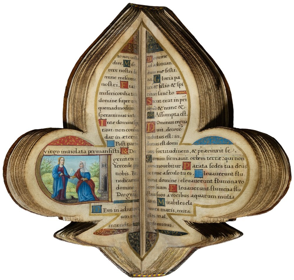 Эта уникальная книга имеет форму флёр-де-лис - цветка лилии, геральдического символа французских королей и символа чистоты Девы Марии. По французской легенде, король франков Хлодвиг обратился в 496 году в христианство, после чего ангел дал ему золотую лилию как знак очищения. В другом варианте легенды утверждается, что Хлодвиг взял себе в качестве эмблемы лилию после того, как водяные лилии в Рейне подсказали ему безопасное место, где можно перейти реку вброд, благодаря чему он одержал победу в битве... (Википедия) Флер-де-лис в руках короля Франции Филиппа IV Красивого: Именно в форме лилии был выполнен рукописный часослов для французского короля Генриха II (1519 –1559). Он был создан во Франции (вероятно, в Париже) около 1555 года. Часослов имеет небольшие размеры – 18 сантиметров в высоту и 8 сантиметров в ширину. Текст написан на латыни и украшен цветными миниатюрами: одни иллюстрируют каждый месяц (знак зодиака и проводимые в это время работы), другие связаны с библейскими сюжета