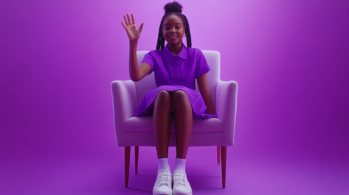 Создано на основе запроса: black nervous teenage girl, movie poster, sits in chair waving at the camera, purple dress and white sneakers