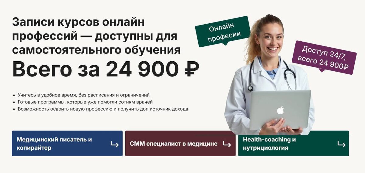 Вы просили — мы открыли: архивные курсы в записи по суперцене! Школа онлайн-профессий закрыта, живые потоки больше не проводятся. Но после большого количества запросов решили сделать апдейт — открыли доступ к архивным записям курсов. В записи будут доступны три курса — но только для самостоятельного обучения: 1. Медицинский копирайтер и писатель — Освойте навыки написания научных и популярных текстов, создайте портфолио и начните зарабатывать уже на курсе. Это реально для врачей, которые никогда не считали себя писателями 2. SMM-специалист в медицине — ежедневно клиники, врачи и фармкомпании размещают десятки вакансий. Медицинское образование станет огромным плюсом 3. Health-коучинг и нутрициология — Идеально подойдет тем, кто хочет продолжать помогать пациентам, но устал от тяжелого и неудобного графика и низкооплачиваемой работы. Медицинские знания и опыт позволят войти в профессию с преимуществом и найти первых клиентов Теперь вы сможете освоить новую профессию в комфортном те
