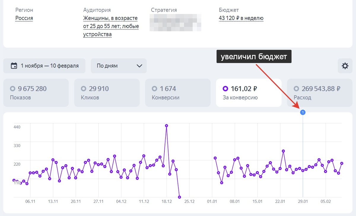 10 дней назад увеличил недельный бюджет с 31к до 43к по рекомендации Яндекса. Цена конверсии не изменилась.