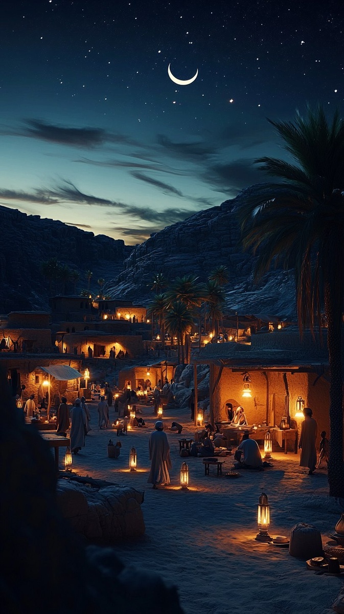 Создано на основе запроса: A hyper-realistic cinematic night scene of a 7th-century Hijaz village, mudbrick homes under a starlit sky, glowing oil lanterns, families gathered for final iftar of Ramadan, crescent moon rising in the background, warm atmospheric lighting, soft twilight shadows, ancient palm trees, early Islamic era mood