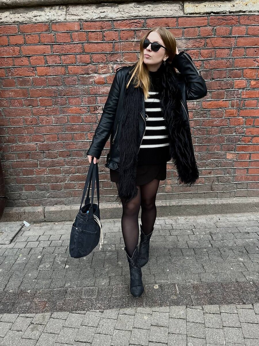 В Петербурге весна теплая к нам заглянула и Свинка воспользовалась погодой для выгуливания своих нарядов Составляющие части наряда: Удлиненная косуха черного цвета Базовый джемпер в полоску Юбка-шорты Полупрозрачные колготки Казаки из денима Сумка из джинсовый ткани Ну и меховой шарф из вчерашнего поста P.S. Гуляли много часов и конечно, же каблук хоть и удобный у казаков, это не сильно спасло от неимоверной усталости