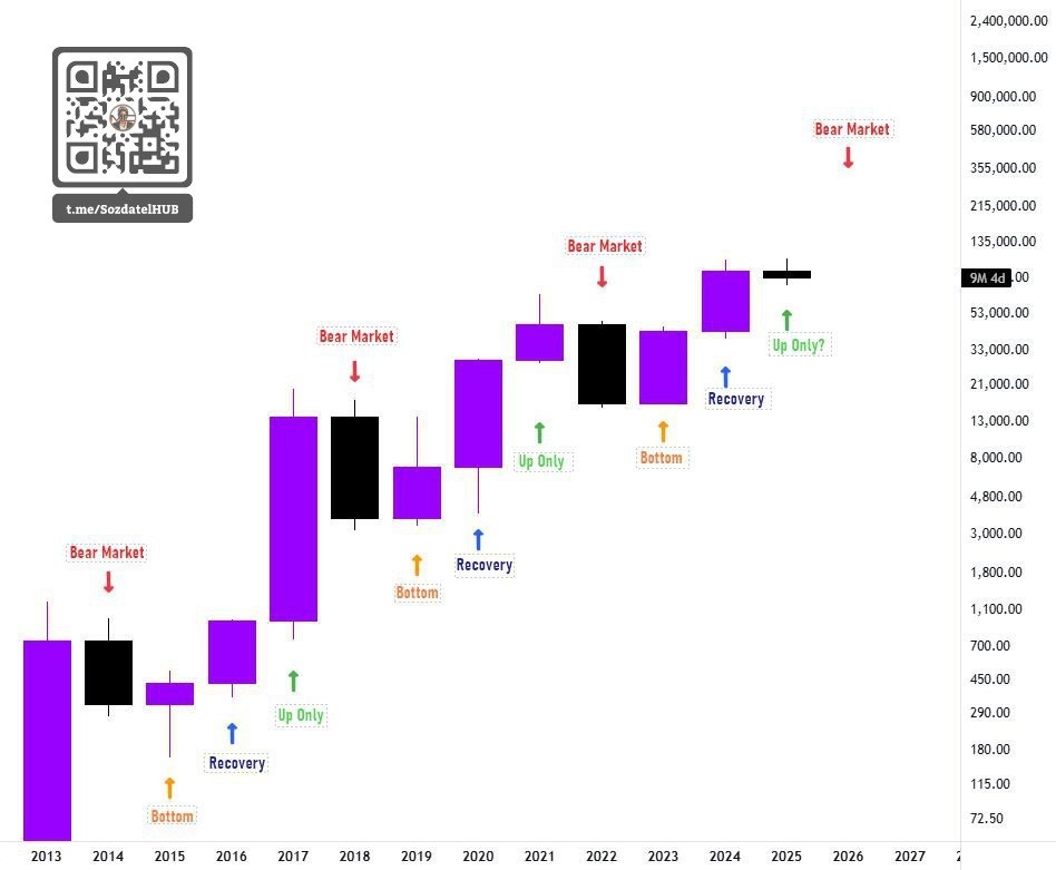#твиттер(Х) Mags: "Если посмотреть на годовой график Биткоина, он следует простому циклу уже три раза подряд: 1. Дно 2. Восстановление 3. Только рост 4. Медвежий рынок После медвежьего рынка Биткоин находит дно, а затем в год восстановления обновляет исторический максимум (ATH). Затем следует мощный рост в году "Только рост". Сейчас мы находимся в этом самом году "Только рост", и большая зелёная свеча ещё впереди. Каждый раз годовая свеча "Только рост" закрывалась выше, чем свеча предыдущего года. Если этот сценарий повторится, то даже в худшем случае мы должны увидеть новый ATH в этом году. Небольшой толчок текущей годовой свечи может легко поднять Биткоин выше $200K+. Медвежий рынок, скорее всего, начнётся со следующей годовой свечи (2026)." |HUB|