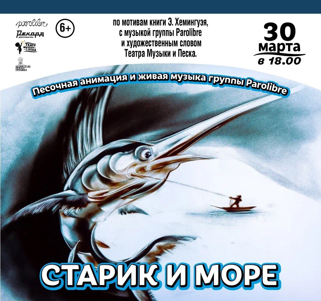 Сегодня в 18:00 в Центре культуры «Рекорд» на спектакль-фантазию по мотивам повести Эрнеста Хемингуэя «Старик и море» . На спектакле вы окажетесь в лодке со стариком, почувствуете солёный морской воздух и яркое палящее солнце. И это желание, почти детское, скорее увидеть, что же это за рыба. Старик поймал рыбу – это знают все, а вот то, что марлины живут до 27 лет, а их масса тела может превышать 820 кг, вы знали? Это сравнимо с весом легковой машины. А теперь представьте, каково это – вступить в борьбу с таким гигантом? Это история про победу человеческого духа над жестокостью жизни, рассказанная через песочную анимацию художником Анной Стрелковой. Музыкальное сопровождение – нижегородская группа Parolibre. «Это звучит как весна» — так говорят те, кто уже слышал группу Parolibre. Основанные на развернутых рояльных полотнах, их зарисовки замешаны на образности, многослойности и эстетике кинематографического. Черпая вдохновение в японском нью-джазе, работах Рюити Сакамото и игровы