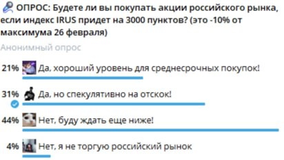 На прошлой неделе было 4 опроса! Проверим кто был Вангой: 1️⃣ Опрос по покупке индекса на 3000 пунктах! 44% ждут индекс ниже 3000 и не хотят покупать! 31% готовы взять на отскок, а 21% уже считают этот уровень хорошим для среднесрочных покупок в преддверии будущего перемирия. Тут мы еще не знаем кто окажется Вангой, но настроения понятны. 2️⃣ Опрос по инфляции! Инфляция была +0,12%, то есть она все еще высокая. Бенефициарами роста стали картофель +4,2%, свекла +2,8%, капуста +2,0% помидоры +1,7%. При этом огурцы откатили -5,1%. 46% - Ванги, которые разбираются в плодоовощной инфляции! Индекс действительно скорректировался на такой инфляции. Инфляция всё еще далека от таргета, а это значит, что снижение ставки пока далеко, не смотря на оптимизм лонгустов по рынку. 24% голосовало за памп рынка на том, что инфляция будет стремиться к нулю. 3️⃣ Опрос по паре юань-рубль! Юань-рубль закрылся на уровне 11,6850, а это значит, что 37% - Ванги! Это был самый популярный ответ! На втором месте