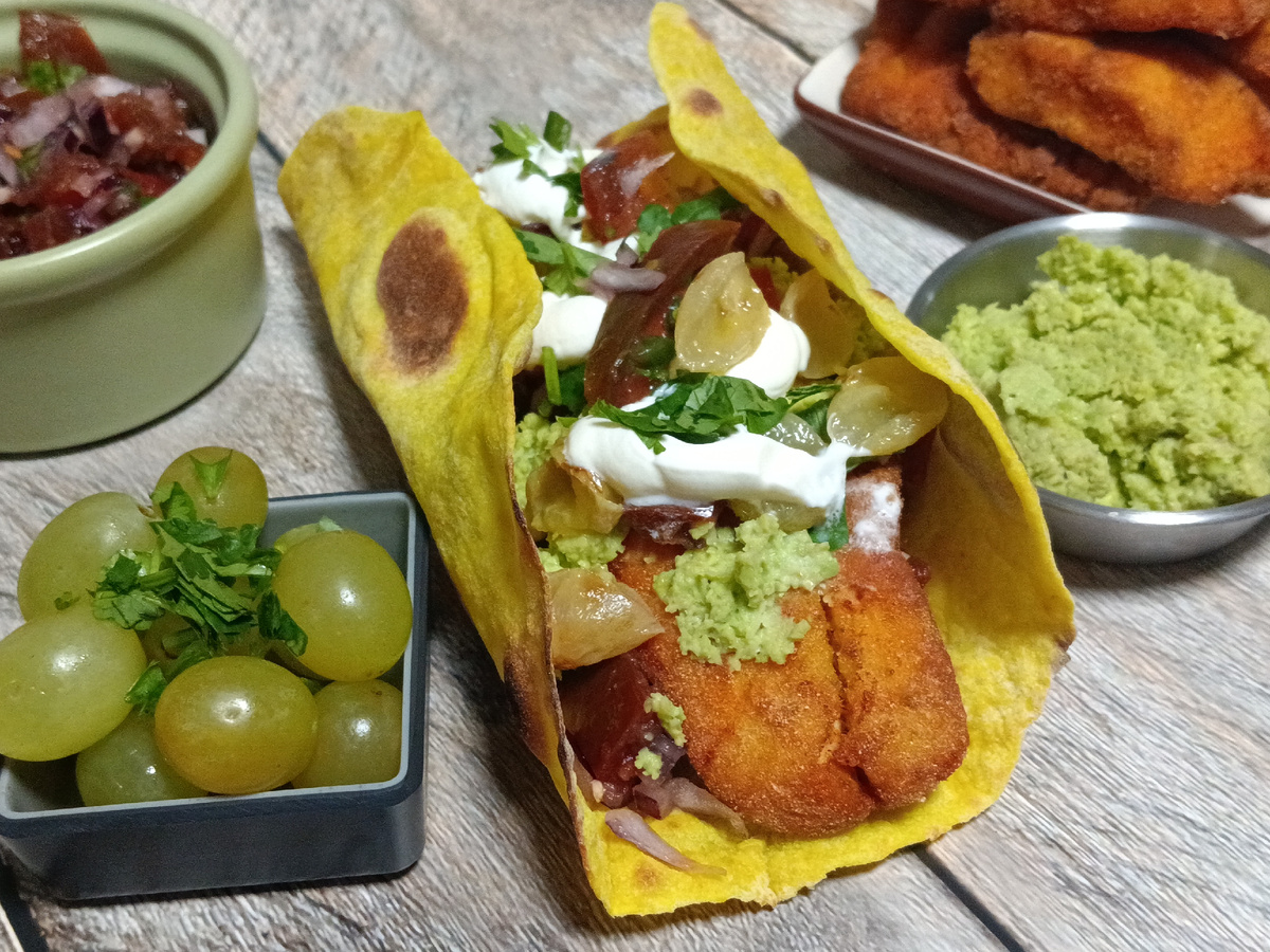 Нежнейшая рыба в пикантном маринаде, обжаренная до хрустящей корочки. Сладкий запеченный виноград. Восхитительная томатная сальса. И все это в сочетании с мягкими лепешками, освежающим авокадо и нежным шлейфом сметаны – это идеальное сочетание вкусов и текстур.