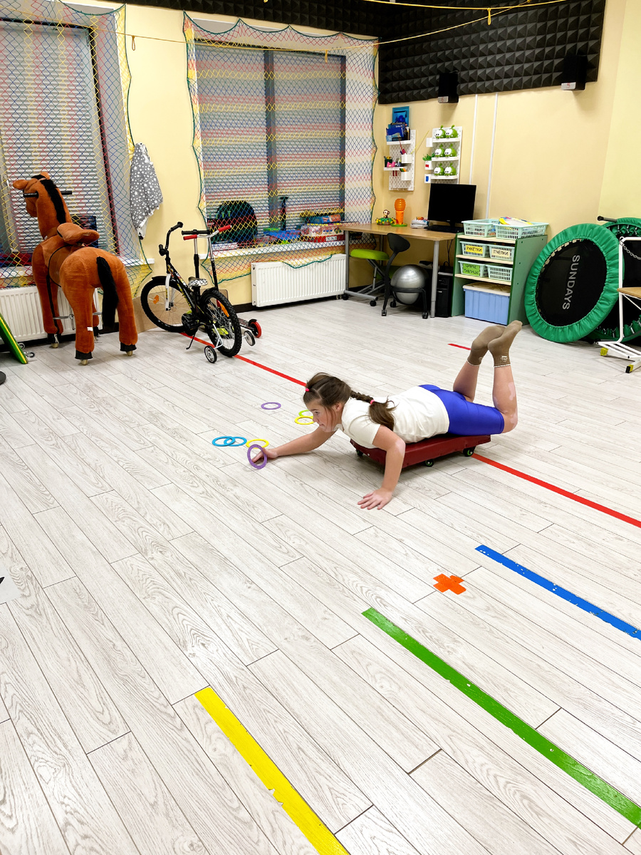 Эта тележка — инструмент из мира сенсорной интеграции. Дети ложатся на неё животом, отталкиваются руками, скользят, поворачиваются, придумывают маршруты. Это не просто весело — это запускает целую цепочку процессов в организме.