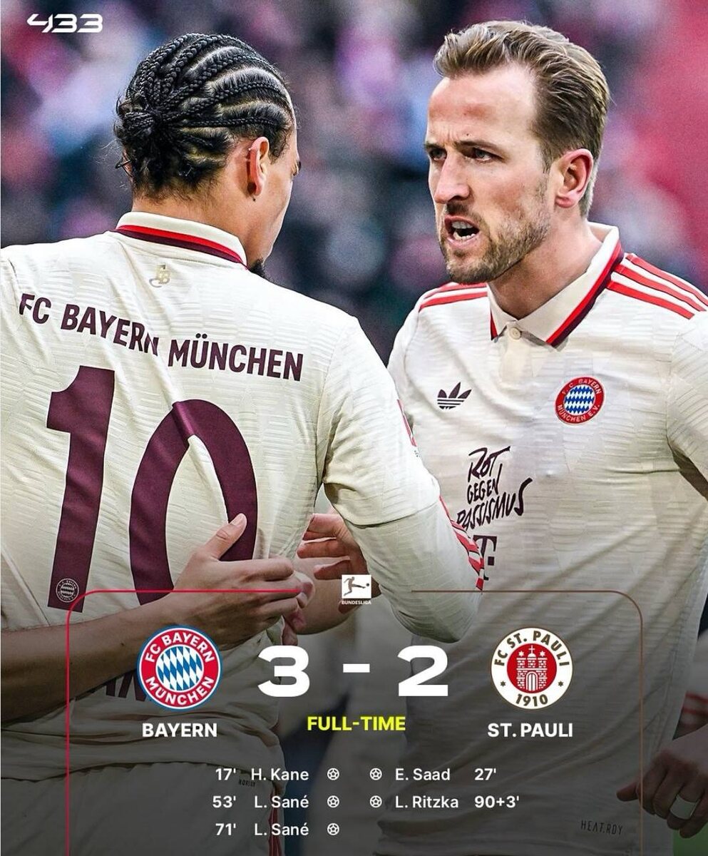 «Бавария» победила в Бундеслиге впервые за три последних матча. Кейн забил и отдал ассист, у Сане — дубль. Отрыв от «Байера» в таблице — 6 очков. Но ситуация «Баварии» перед матчем с «Интером» в ЛЧ не такая радостная: Дэвис - травма Упамекано - травма Ким Мин Джэ - травма Павлович - травма Нойер - травма Коман - травма Бухманн - травма