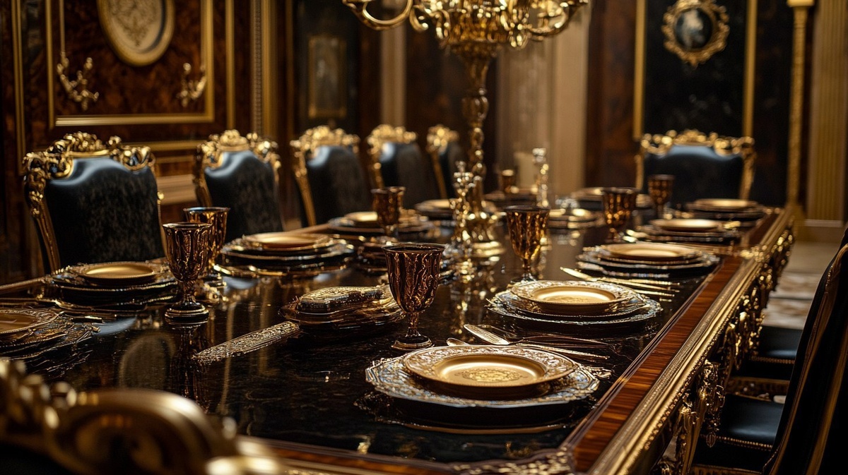 Создано на основе запроса: a mahogony and obsidian table, rectangle table, plates carved from jet, cups carved from sapphire, golden silverware, mansion,