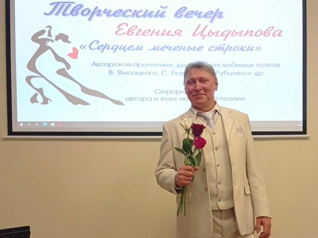 Евгений Цыдыпов родом из Челябинска, живет в Копейске. Его сложно назвать молодым поэтом — он 1962 года рождения. Однако он является активным членом молодого молодежного литературного объединения «Диалект» (уж простите за тавтологию), которое занимает почетное третье место среди всех ЛИТО России. Стихи Евгения Цыдыпова выпускаются отдельными сборниками, удостаиваются наград на поэтических конкурсах, становятся песнями. Трубка мира погасла. Нашу землю не тронь! Оружейное масло Подливаем в огонь. Глаз слезится от гари. Мысли быстры и злы. Бледнолицые твари В ста полетах стрелы. Две походные сумки, Амулет из клыков. Боевые рисунки Устрашают врагов. Наша сочная травка Почернела в костре. Я с одним томагавком Против огненных стрел. Продвигаюсь упрямо На защиту всего — За родные вигвамы, За любимую скво! В заколоченной клетке Для другого тропа. Безупречные предки Не признают раба. Полосатое знамя Не допустим в свой лес. Духи местные с нами, С нами сила небес! Не хочу быть изгоем, Жить судьбо