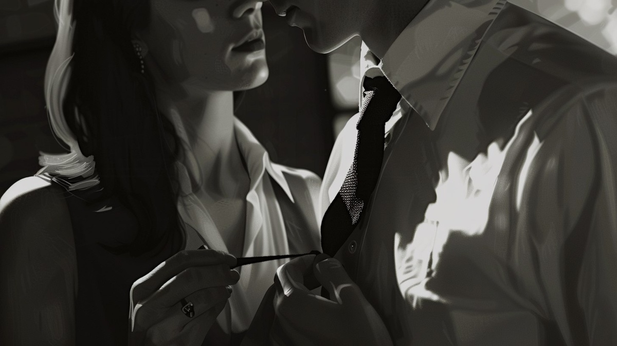 Создано на основе запроса: a cinematic storyboard frame showing a close-up of a woman tying a man’s necktie, only their hands and the tie are visible, soft morning light illuminating the scene, gentle and intimate atmosphere, fabric texture and fingers in focus, shallow depth of field, brush sketch style, monochrome tones