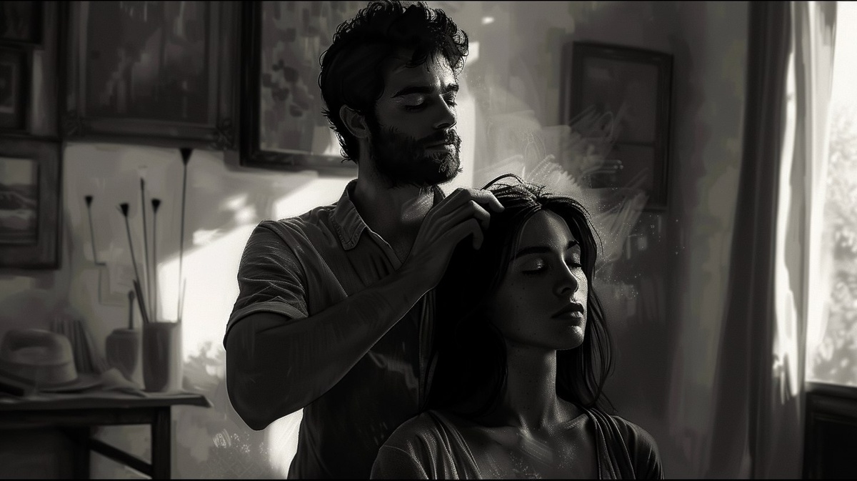 Создано на основе запроса: a cinematic storyboard frame of a man gently brushing a woman’s hair from behind, warm morning light streaming in