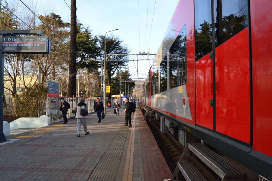 Электропоезд " Имеретинский курорт-Туапсе" на станции Туапсе. На улице тепло, но не жара. Больше похоже на весну, чем на лето.