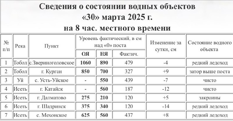 ⚠️ Сводка по уровню воды в реках Зауралья на 30 марта: