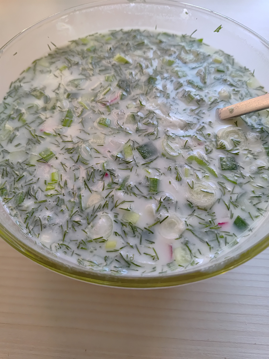 Добрый день! На улице весна и уже хочется чего-то освежающего 😁 Для меня это окрошка. Окрошка — традиционный холодный суп русской кухни, который готовят в весенне-летний период. Классический суп представляет собой смесь сырых овощей (огурцы, редис и зелёный лук), отварного картофеля, яиц, варёного мяса (говядина, телятина, сосиски или ветчина) и кваса. Окрошку обычно заправляют сметаной. В более поздних вариантах вместо кваса используют светлый или разбавленный кефир, сыворотку, айран или газированную воду. Зелёный лук и укроп вымыть и обсушить бумажными полотенцами, мелко нарезать, затем сложить в большую миску. Свежие огурцы вымыть, обсушить и нарезать кубиками. Редис вымыть, нарезать кубиками или тонкой соломкой. Ветчину тоже режем кубиком 🤗 Я использую Ветчину из индейки. Вместо ветчины можно добавить варенную колбасу или отварное мясо. Но мне все же больше нравится с ветчиной 😁 Добавить отварной картофель и яйца, нарезанные кубиком Все хорошо перемешать. Посолить. Подаём порцио