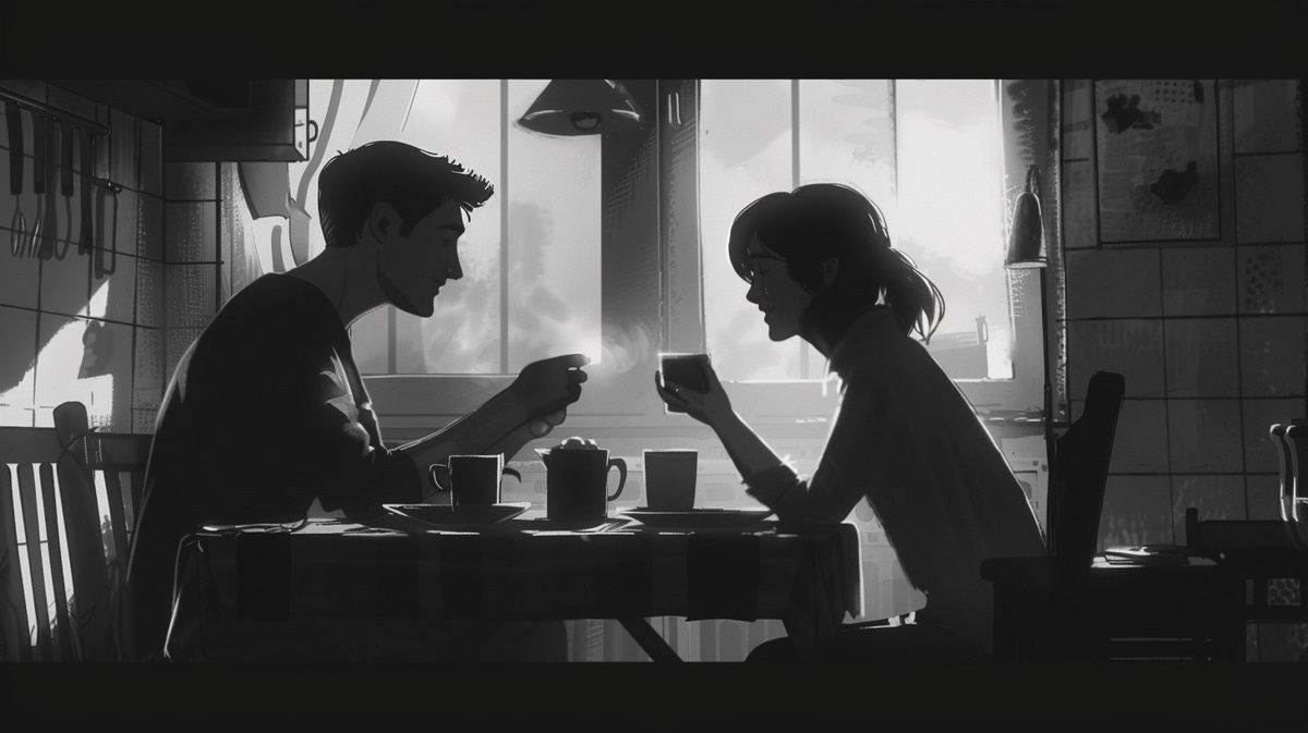 Создано на основе запроса: a cinematic storyboard frame showing a couple sitting across from each other at a breakfast table, smiling as