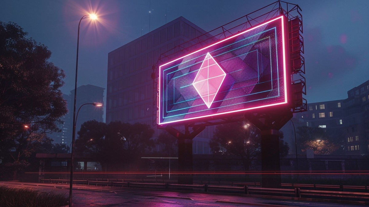 Создано на основе запроса: A large outdoor billboard at night, featuring a polygonal diamond made of pixel-style LED lights. The diamond emits a vibrant pink-blue-purple gradient glow, standing out against a dark urban cityscape. The billboard has a sleek, modern design with subtle reflections. Cyberpunk aesthetic, realistic lighting, high detail, cinematic composition