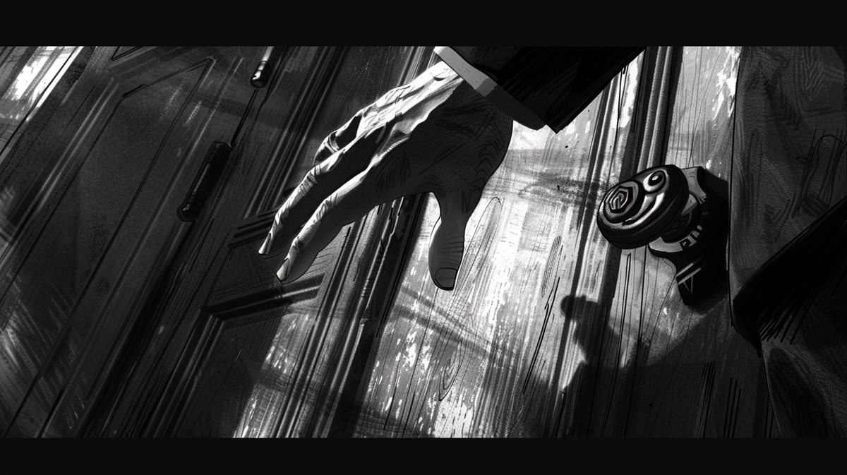 Создано на основе запроса: a cinematic storyboard frame from the man’s point of view, close-up of his hand reaching for and turning a door handle, soft morning light casting gentle shadows on his hand, wooden door and floor visible, emotional and quiet atmosphere, slightly tilted angle to mimic natural gaze downward, subtle ring on finger, brush sketch style, monochrome tones