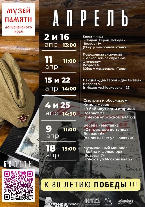 ✨ Экскурсии с музеем Лопасненского края в АПРЕЛЕ Запись на экскурсию по телефону: +7(496)726-7770 Мероприятия проходят по адресу ул.Московская, д. 22 и с.Новый быт, ул.Новая д.8А 👉Билеты можно приобрести онлайн на сайте музея https://мплк.рф/ (в том числе «Пушкинской картой»), по QR-коду в музее, в кассе за наличный расчёт. Цена билета: 💲 детский – 100 рублей 💲 мастер-класс– 150 рублей 💲 взрослый – 150 рублей (сопровождающий педагог – бесплатно). 🚫 Возраст: 6+ 🏢 Музей памяти Лопасненского края 📍 г. Чехов, ул. Московская, д.22 #webЧехов ✅ Мероприятия Чехов https://dzen.ru/id/66cc4b48e9ef144699238a51 http://vk.com/chekhov_events http://dzen.ru/chekhov_events