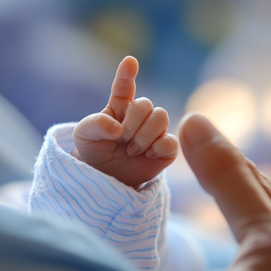 Создано на основе запроса: Close up bokeh photo of an baby’s hand in a number one hand sign at the Driscoll children’s hospital, a doctor is holding the newborns wrist.
