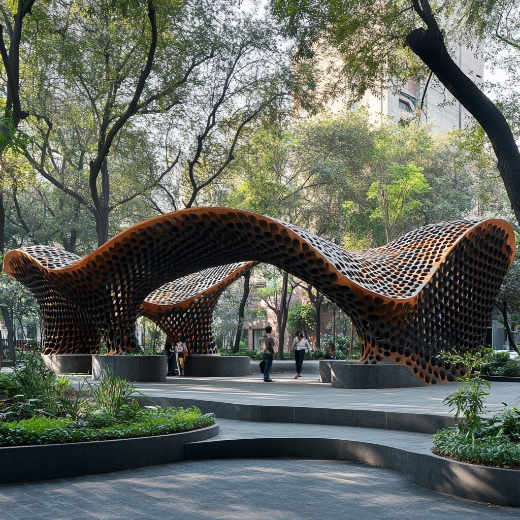 Создано на основе запроса: enviroment, a contemporary pavilion located in Alameda Central, CDMX, composed of 3D-printed modular units arranged in a flowing, sculptural configuration. The modules are made of dark-toned clay or concrete, forming a repeating lattice pattern that provides partial shade and visual transparency. The design blends minimalism and urban sensitivity, offering a public space for rest, gathering, and reflection. The floor is made of gray tiles, surrounded by green planters that integrate the pavilion into the park setting. People walk around and interact with the structure, creating a vibrant social atmosphere. Soft natural light and shadows emphasize the geometry of the pavilion in a historic and active urban enviroment. --- Автоперевод: Enviroment, современный павильон, расположенный в Alameda Central, CDMX, состоящий из 3D-печать модульных единиц, расположенных в плавной скульптурной конфигурации. Классно получилось? 🤔 https://dzen.ru/id/65c0c65c86e4f837c27b