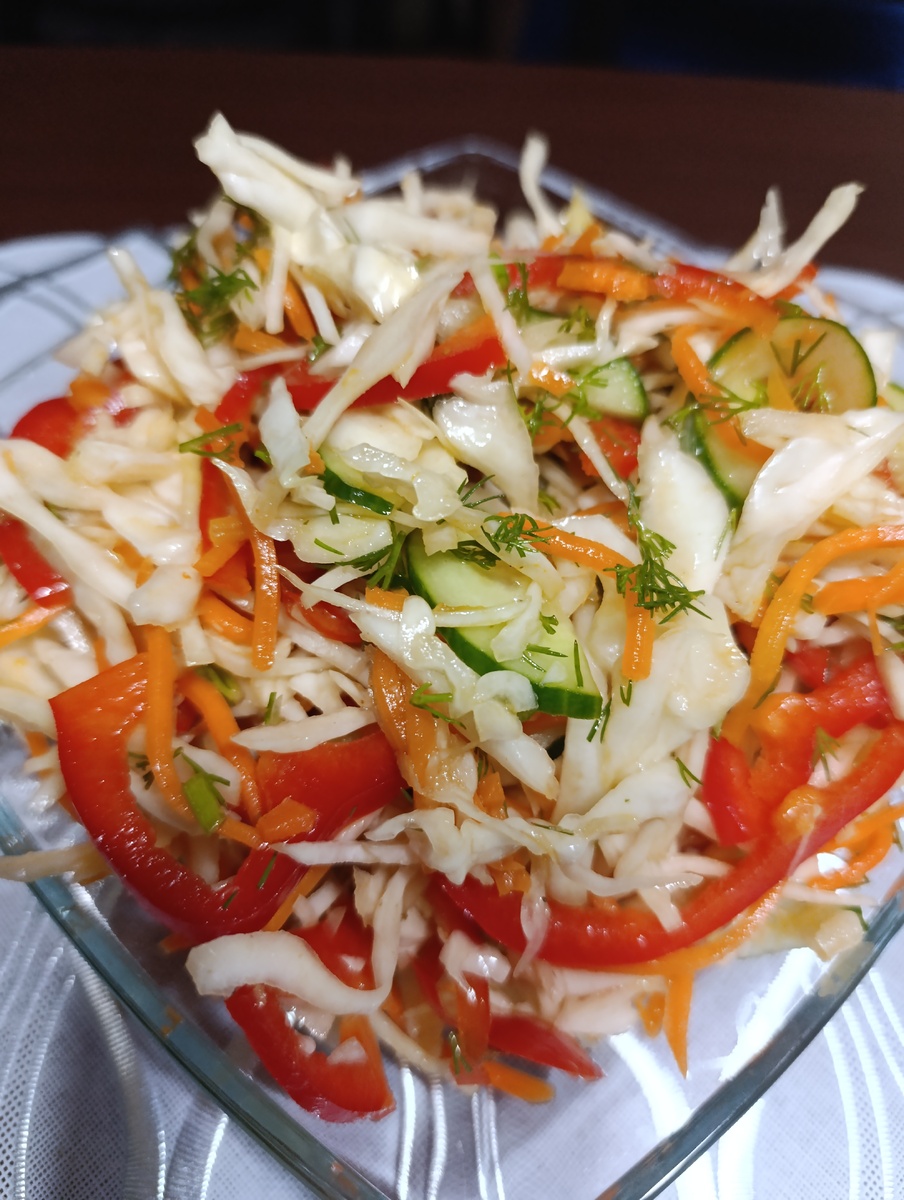 Ингредиенты: капуста 300 гр перец болгарский 1 шт огурец 1 шт корейская морковь 50 гр зелень, соль, масло растительное по вкусу Капусту шинкуем, перец очищаем от семян и нарезаем полосками, огурцы нарезаем тонкими полукольцами. Добавляем измельченную зелень, корейскую морковь, соль, растительное масло. Перемешиваем. Приятного аппетита!!!