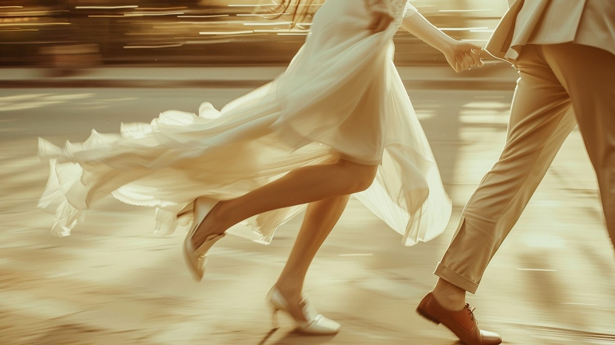 Автоперевод: Кинематографическая рамка раскадровки, показывающая побочный вид на то, чтобы мужчина и женщина бегали вместе, только их ноги и ноги, женщина в плавном белом платье, а также мужчину в туфлях и бежевых брюках костюма, мягкое размытие движения, предполагающее движение, естественный светлый свет, романтическое и энергичное настроение, стиль кисти, монохромные тона, тона