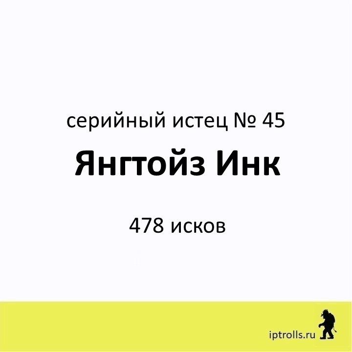 Мы собрали информацию о правообладателях, массово подающих претензии и иски в защиту авторских прав и прав на товарные знаки, а также полезные материалы и рекомендации, чтобы вы могли: Сейчас в базе более 60 серийных истцов. Вы можете проверить, не нарушаете ли вы чьи-то интеллектуальные права в рамках своего бизнеса или проекта, получить ответы на популярные вопросы и проконсультироваться. Правообладатель Янгтойз Инк внесен в базу IPTrolls под № 45. Переходи в карточку правообладателя на сайте IPTrolls, чтобы узнать больше. Если вы не нашли ответ на свой вопрос, посмотрите другие материалы проекта или напишите нам через форму на сайте. _____________________ команда проекта IPTrolls 🕵🏻♂️Следите за обновлением базы