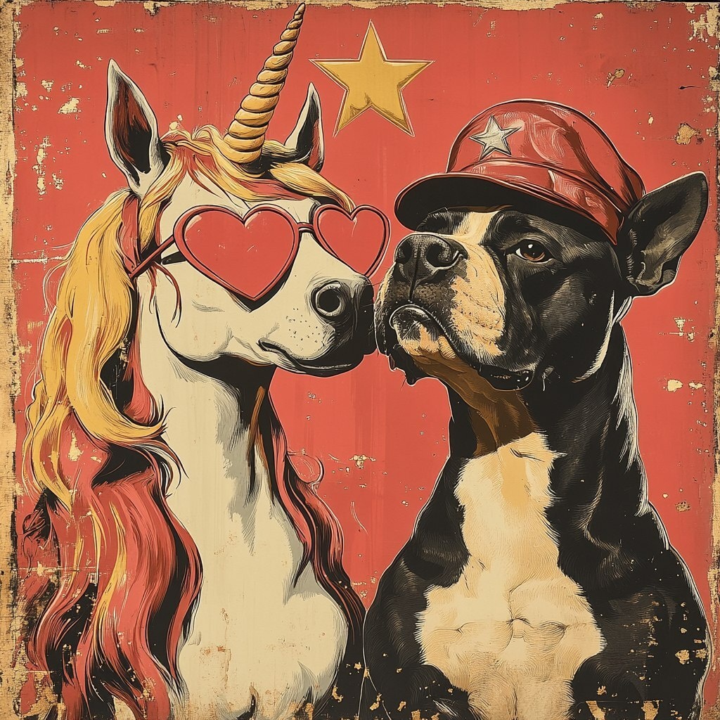 Создано на основе запроса: Cuban Communist Propaganda poster of two characters, a back to back logo of a unicorn horse queen witch wearing heart shaped spectacles and a fullbred boxer dog wearing a ché Guevara hat, the unicorn horse queen witch has a long strawberry blonde mane, there is no text on the poster just the two characters --- Автоперевод: Кубинский коммунистический пропагандистский плакат с двумя персонажами, логотип спины к спине бодющей Королевы единорога, одетая в душистые очки в форме сердца и собака с полной боксером, одетая в шляпу Че Гевара, у юнической Королевы Королева есть длинно Как тебе такая генерация? 🤔 https://dzen.ru/id/65c0c65c86e4f837c27b24d7 #ИИ #AI #нейросеть #midjourney #art