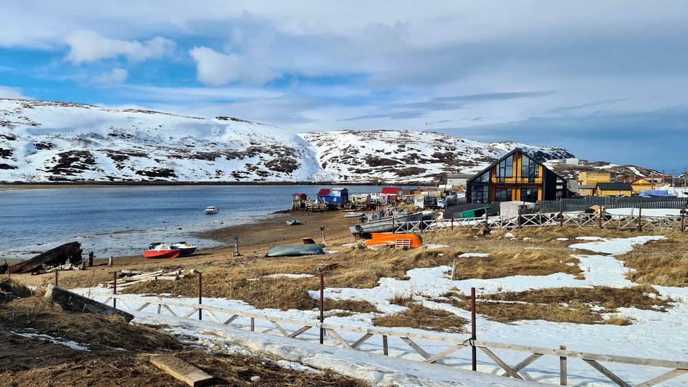 От Мурманска до Териберки 134 км, и 2-3 часа езды. В непогоду проезд бывает закрыт, о чем можно узнать на тут, и на дорожном табло. С ноября по апрель бывают сильнейшие метели, и дорогу заметает настолько, что видишь только бескрайние белоснежные поля. В начале апреля, когда мы ехали в Териберку, некоторые участки замело прилично, и снега было очень много. Нужно ехать с меньшей скоростью и ориентироваться по оранжевым палкам ориентирам на обочине. Териберский часовой встречает гостей на въезде в посёлок.) Териберка состоит из северной и южной части, и разделены рекой Териберкой. Северная часть, или новая Териберка — это Лодейное. Южная час