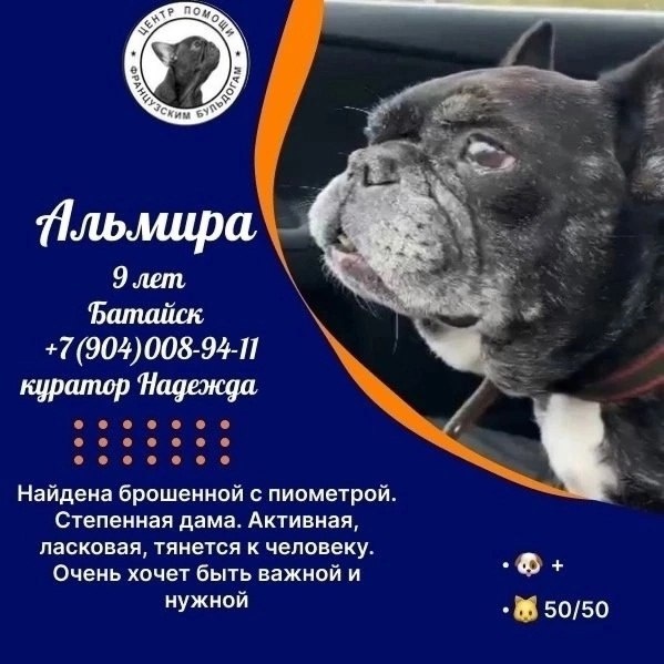 Друзья! Хотели написать, что на пристрой у нас есть замечательная бульдожья бабулька, НО эту нашу подопечную бабушкой даже язык не поворачивается назвать! #Альмира@frenchbull_help https://vk.com/topic-144285450_53749869 У Альмиры от пожилого только возраст - 9 лет, да седины на брыльках. По ощущениям, это вполне себе активная подвижная и игручая собака. 😍 По характеру она абсолютно не вписывается в картину классического бульдожьего старичка. Альмира рада побегать , попрыгать и поиграть, пойти к двери и послушать, кто же там пришел? Все ее болячки на данный момент полностью пролечены и прооперированы. Единственное, небольшая залысина на спине до конца пока не затянулась. Но признаки аллергии и дерматиты купированы. С собаками эта статная дама живет мирно. Поэтому ее можно в семью вторым или третьим питомцем. Главное любимым, а остальное не важно 🙂☝️ С кошками она выборочно. Нет, она не бросается с агрессией на усатых, но не прочь затеять игру и погавкать. 👉 https://vk.cc/cKkG7v