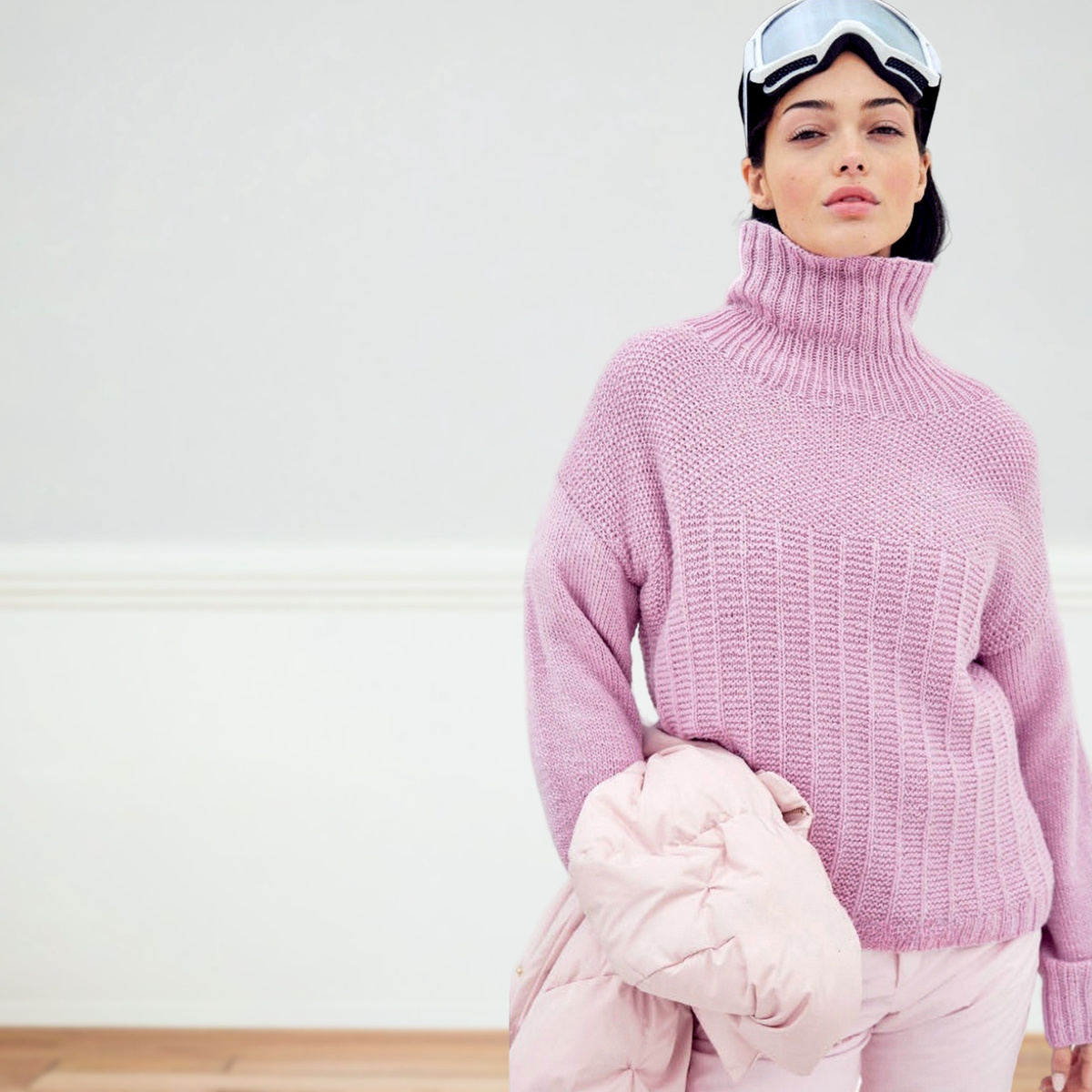 Сборка. Выполнить плечевые швы. Для высокого воротника по краю горловины на круговые спицы № 4,5 набрать 130 п. и связать 7 см резинкой В, затем перейти на круговые спицы № 5 и вязать резинкой А. Через 17,5 см от набора все петли свободно закрыть. Вшить рукава. Выполнить швы рукавов и боковые швы.
