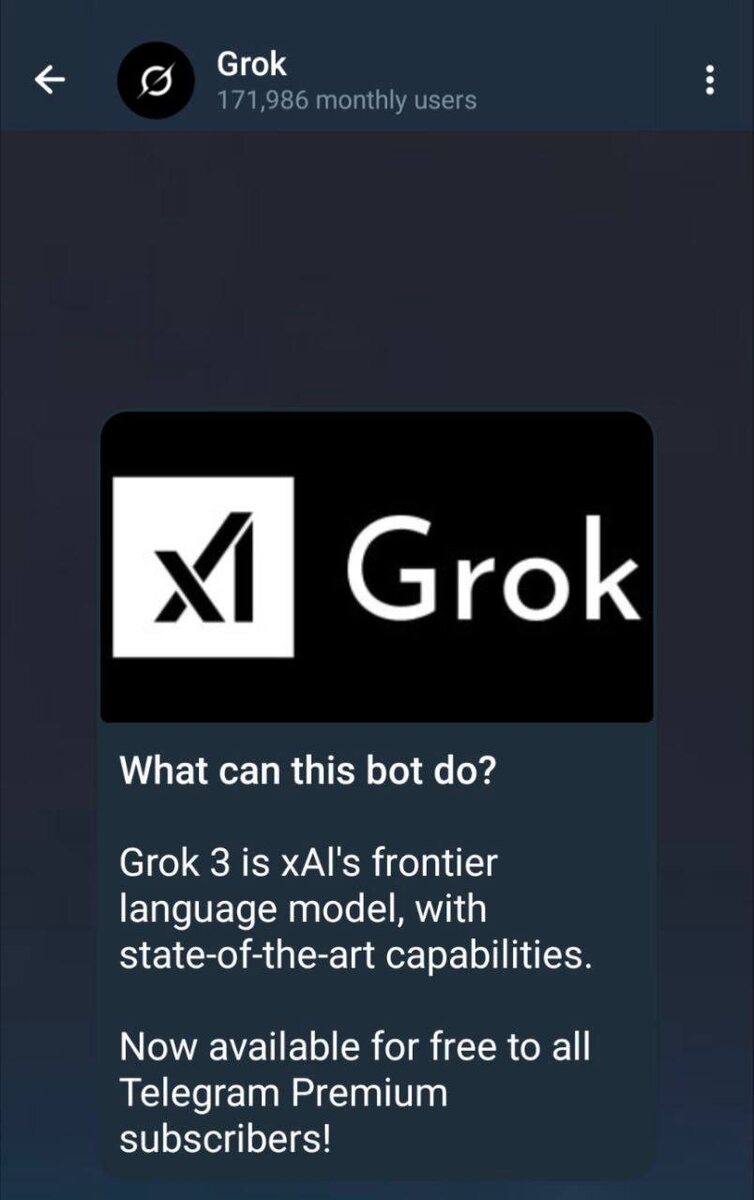 👍🔥Ну и оч крутая новость! ⚡️Grok от Маска официально пришёл в Telegram Илон Маск лично подтвердил интеграцию своего чат-бота Grok в мессенджере Telegram. Павел Дуров таинственно намекнул на эту возможность в своем посте в X на прошлой неделе. Правда, есть несколько нюансов. В отличие от версии в X, телеграм-бот пока не имеет официальной галочки верификации. А доступ к боту получат только пользователи с подпиской Telegram Premium. Бот находится по этой ссылке — @GrokAI.