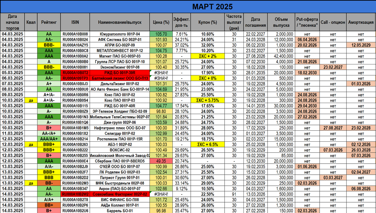 😉 Доброго воскресного, друзья! Досуг скрасит короткий пост со всеми выпусками первого весеннего месяца года :) На самом деле, почти со всеми - есть у нас еще одна бумага в понедельник, и кучка неликвидных выпусков за кадром, но это не столь принципиально. 🔸 Рекордное на моей памяти количество размещений за месяц, даже скриншот пришлось разбить на два. И тем полезнее будет пересмотреть последние релизы и их актуальные цены - может быть, кого-то пропустили :) ⬆️ Наиболее подорожавшими из мартовских являются на данный момент валютные выпуски, но, конечно, их номинал каждый день под актуальный курс подстраивается. Тем не менее, в числе самых дорогих бумаг: $RU000A10B4J5 ПОЛИПЛАСТ П02-БО-03 | 105.89% от номинала $RU000A10B008 ЮЖУРАЛЗОЛОТО 001P-04 | 105.70% от номинала $RU000A10B0C8 МЕТАЛЛОИНВЕСТ 001P-12 | 104.75% от номинала ⏺️ На пятки им наступает пара бумаг высокого кредитного качества пристойной длины: $RU000A10B115 РЖД 001P-40R | 104.77% от номинала $RU000A10B0U0 АВТО ФИНАНС БАНК
