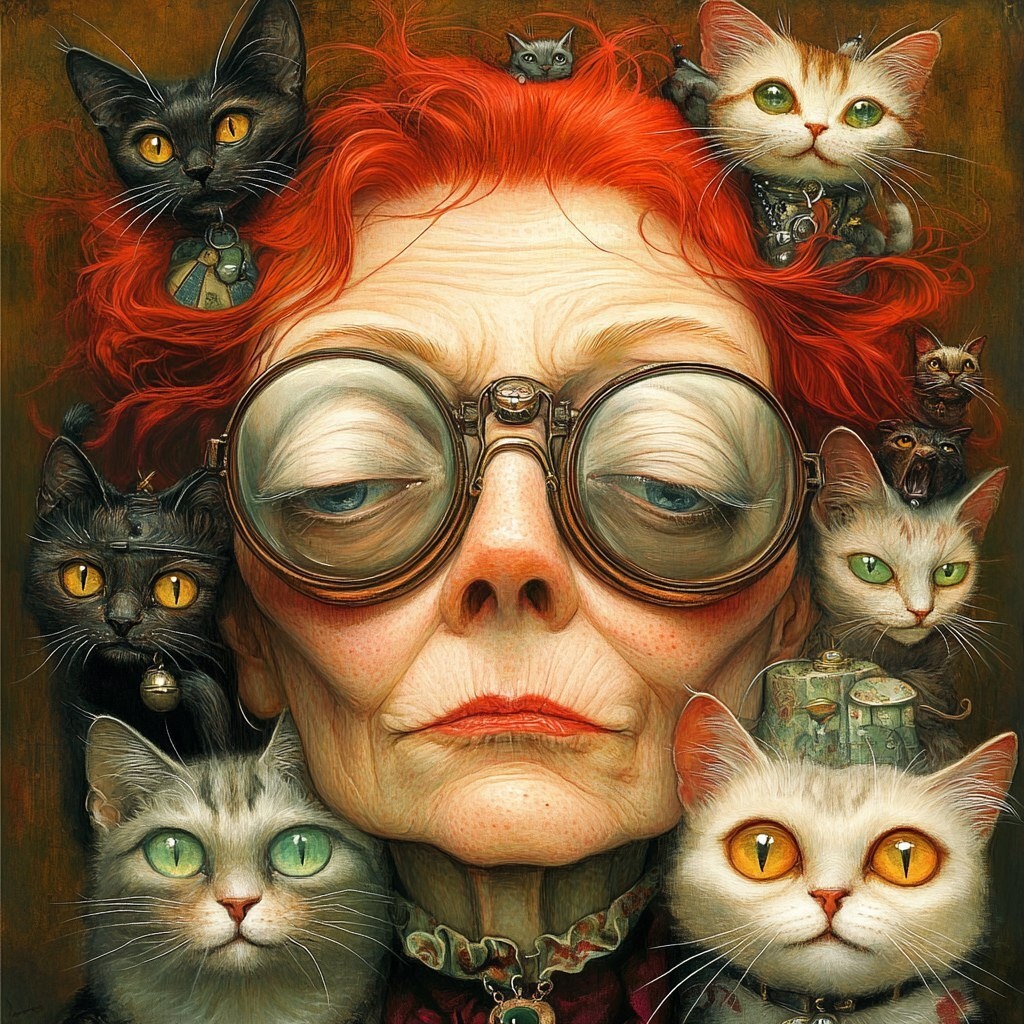Создано на основе запроса: old lady punk rocker with red hair, with her dozens of cats. By Vanja Vukelic, Benjamin Lacombe, Victor Brauner, Eileen Agar, Alex Grey, Michael Cheval and Naoto Hattori. Modifiers: sharp focus extremely detailed fantasy intricate very attractive award winning fantastic view hdr very cute pencil sketch science fiction complex insanely detailed whimsical fantastical art magical surrealism