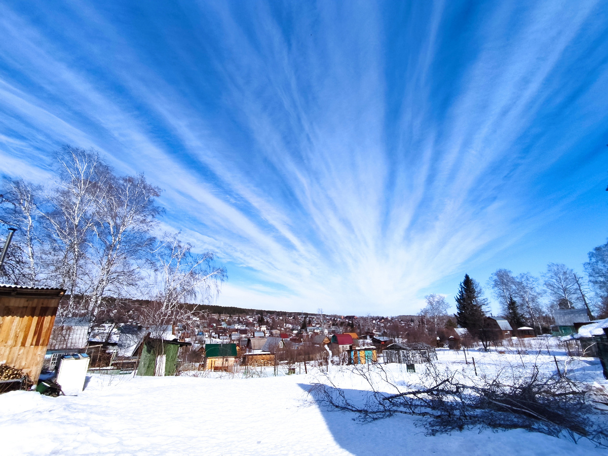 Итак второй день продолжался Вот такое небо было после обеда Дойдя почти до верха приняли решение пилить верхушку с ветвями, так как дальше было лезть опасно, начал подниматься ветер, и сама берёза сверху была уже сухая и гнилая ( Итак вот так выглядела берёза после удаления макушки Дальше дело пошло быстрее, спускаясь спиливали кусочки ствола Дальше мы решили переключится на более простую работу и помогли соседке спилить старую яблоню, она просила сделать это осенью или весной, ну весной и получилось Яблоня шикарная, но ей уже больше 50 лет, и она просто сгнила у основания... Жалко было, но... И ещё немного этого волшебного дня, такое красивое небо было, радужное Жаль фото не передаёт