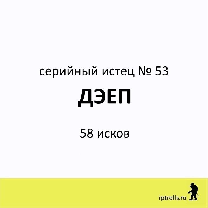 Мы собрали информацию о правообладателях, массово подающих претензии и иски в защиту авторских прав и прав на товарные знаки, а также полезные материалы и рекомендации, чтобы вы могли: Сейчас в базе более 60 серийных истцов. Вы можете проверить, не нарушаете ли вы чьи-то интеллектуальные права в рамках своего бизнеса или проекта, получить ответы на популярные вопросы и проконсультироваться. Правообладатель ДЭЕП внесен в базу IPTrolls под № 53. Переходи в карточку правообладателя на сайте IPTrolls, чтобы узнать больше. Если вы не нашли ответ на свой вопрос, посмотрите другие материалы проекта или напишите нам через форму на сайте. _____________________ команда проекта IPTrolls 🕵🏻♂️Следите за обновлением базы